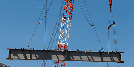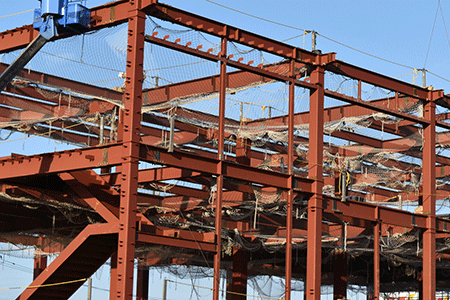 高層ビルなどで、タワークレーンを使い、人間でいうと骨組みになる鉄骨を吊り上げ、組み立てていきます。当然安全に十分配慮した形ですが、高所での作業を行います。「鉄骨建方」と呼びます。安全のためのネットや安全帯の設備の設置も同時に行っていきます
